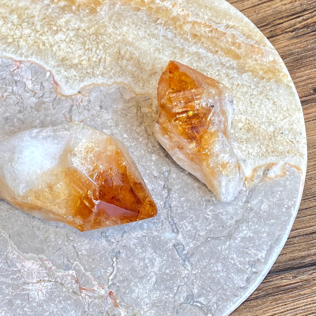 所有帶著淡黃色、橘黃色、褐黃色的透明石英,都是「黃水晶」家族成員。黃水晶的色澤像極了柑橘類的水果,因此其英文Citrine即是來自法文的黃檸檬。黃水晶對應脈輪是太陽神經叢,其溫暖能量也是平衡自信、自尊、勇氣議題最經典的礦石。