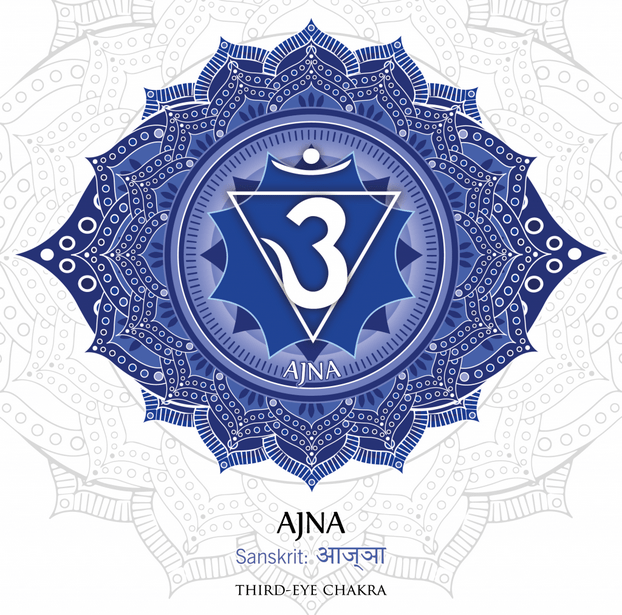 眉心輪位於雙眉中央,梵文原意代表「覺知」和「指揮」,脈輪符號由左右對稱的兩片花瓣組成:左邊花瓣代表「濕婆神」、右邊花瓣代表「夏克緹女神」,當兩者合而為一時,集結六個脈輪的能量將會持續上升至頂輪。中央的梵文符號 “Om”是宇宙全部聲音的集合頻率,該音頻能淨化心靈和肉體的阻礙,表示當左右陰陽兩股能量合而為一時,六個脈輪的統合能量將持續上升至頂輪。