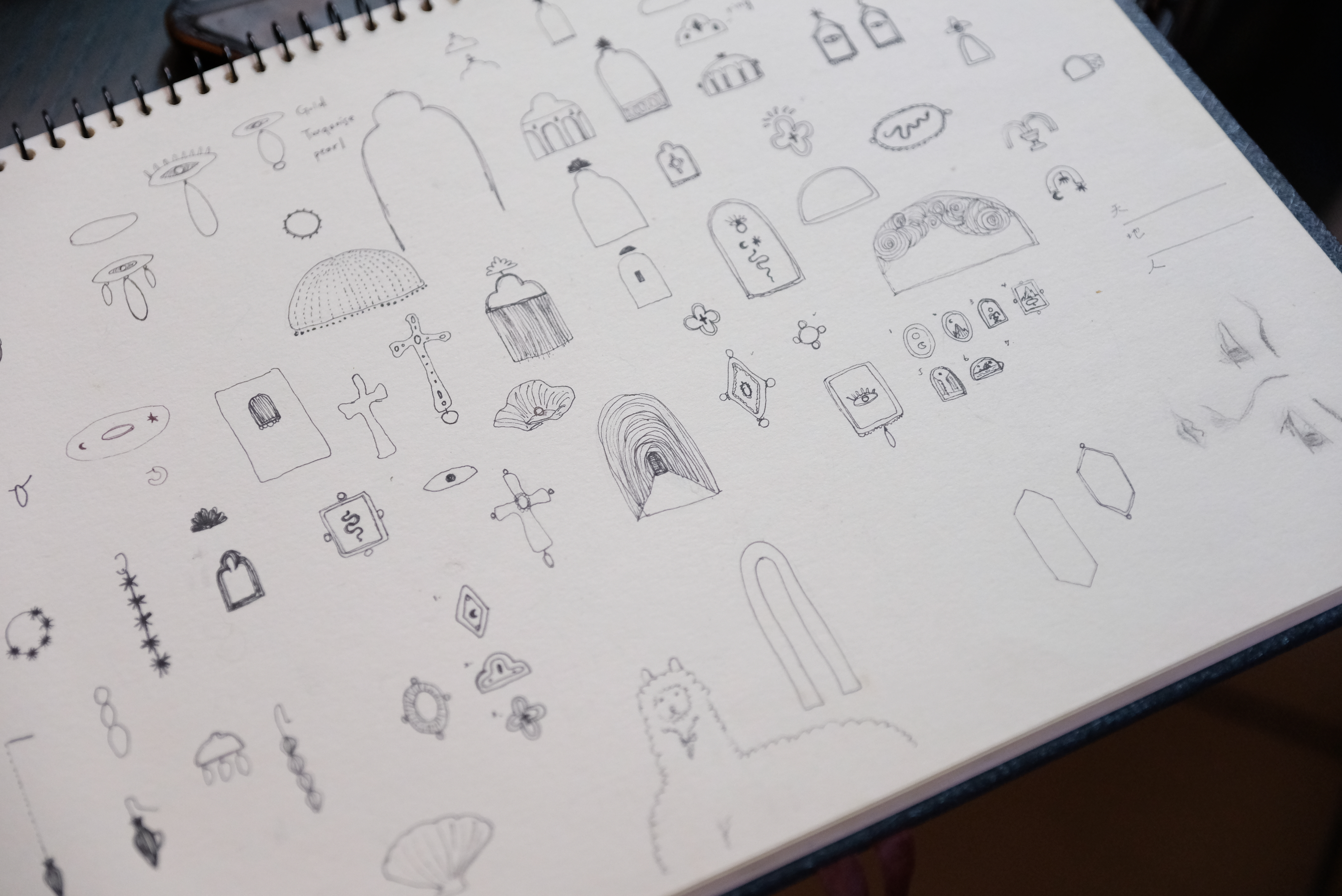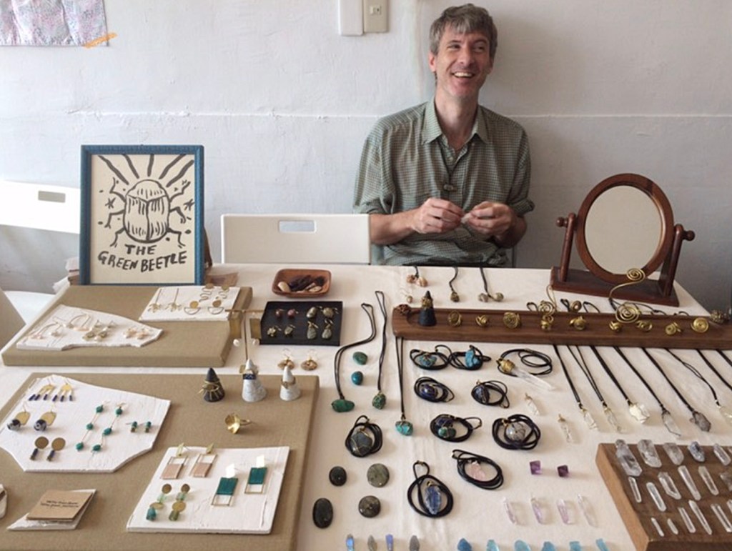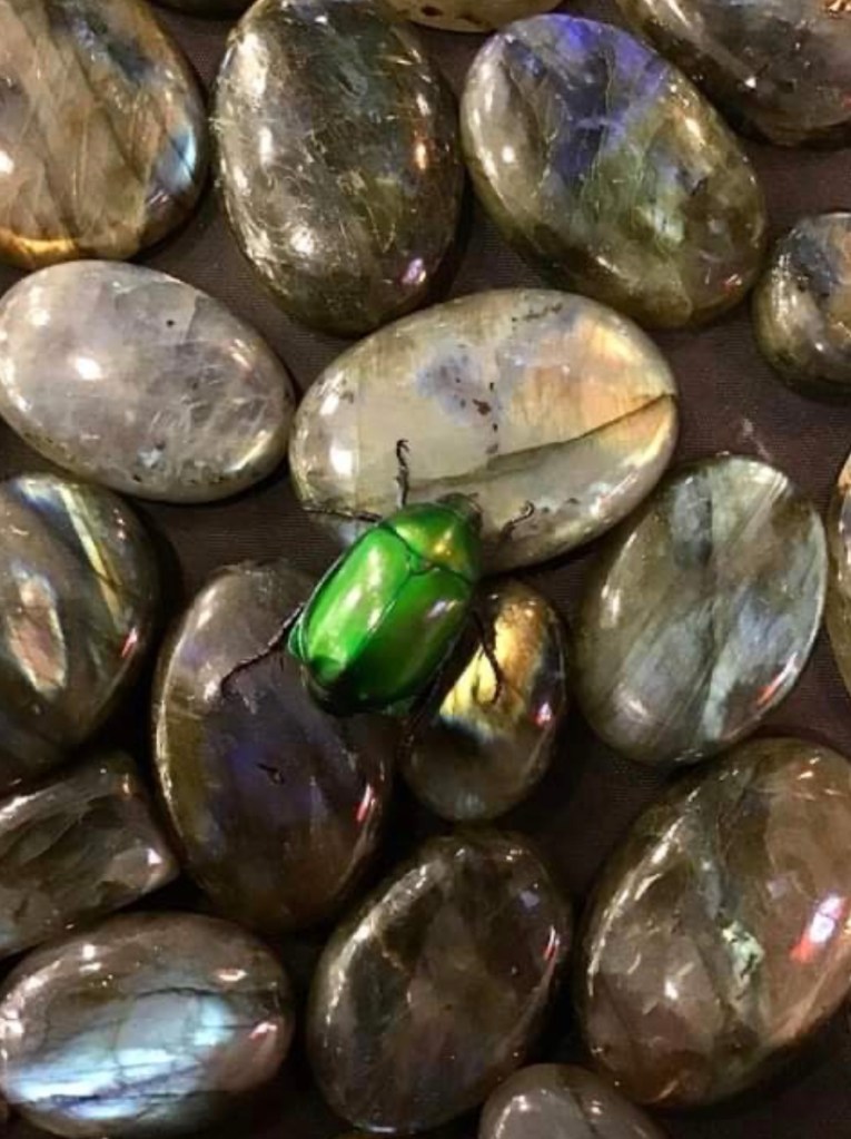 動物給予兩人共時性的啟發,還有品牌的命名緣由。Philippe在台大誠品外擺地攤是綠甲蟲的前身,最初,他販售旅途中搜集天然素材而製成的飾品、自己畫作印成的明信片、來自印度齋浦爾的礦石,為旅程籌基金。駐足攤位前的有好奇的人,也有意想不到的甲蟲。Philippe說他遇過好幾次綠甲蟲,被攤位上閃耀著光暈的拉長石吸引,誤以為是同伴而停留。充滿意外的畫面被Philippe捕捉下來,也成為往後註冊Facebook的帳號名稱,The Green Beetle的起點。