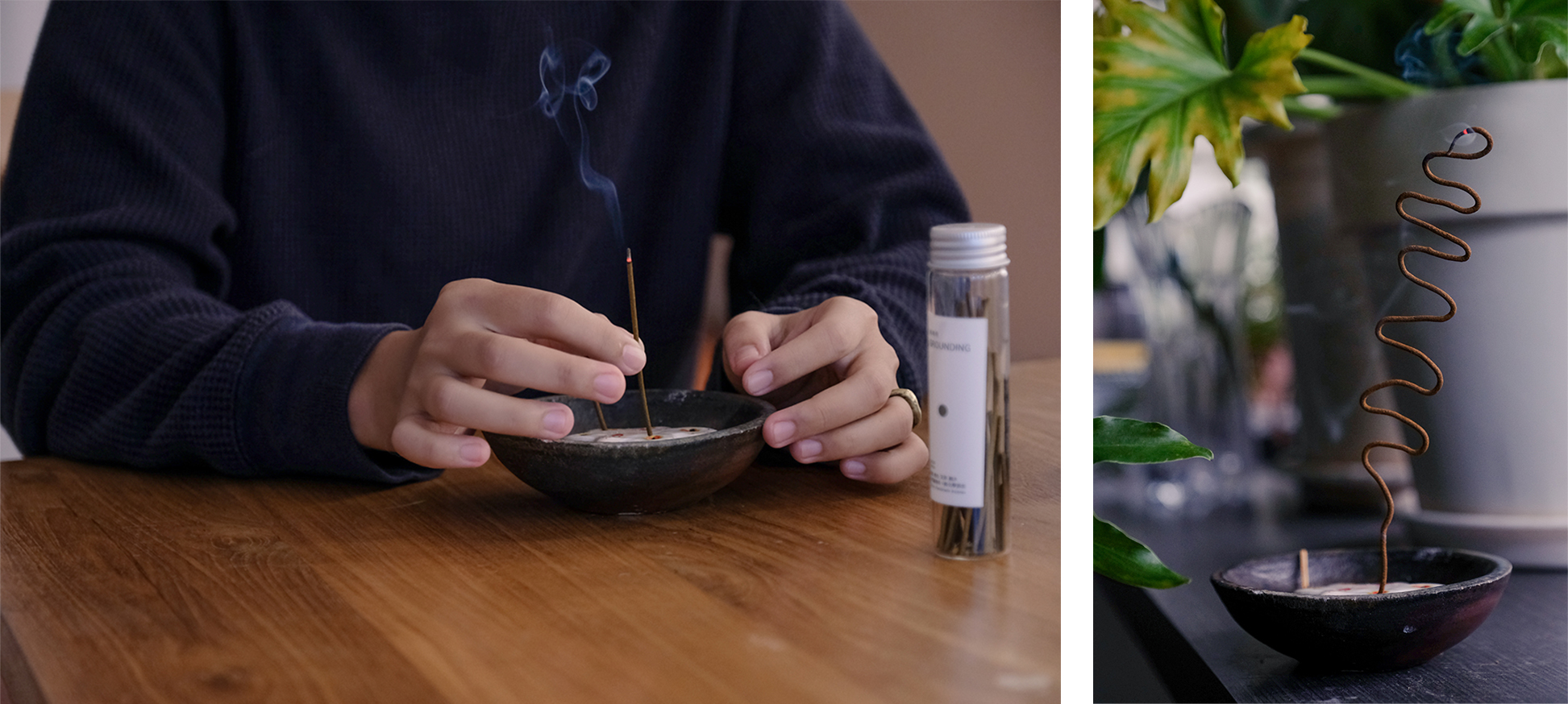 對農學底子的牛來說,當噴霧、蠟燭、線香由自用成為商品的歷程,原物料的品質是他不能退讓的堅持。他因緣際會尋覓到合適進口商,使用從世界各產地直送的精油來製作。此外,他對詮釋香氣的型態,既在意也有十足想法。平時就有搜集素材的習慣,他曾選用竹子為容器灌燭,又或者塑形出彎曲怪誕的線香。面對失敗率極高的製程,卻不減他恣意的創造能量。有顆熱愛藝術的心是他端出奇想之作的驅動。