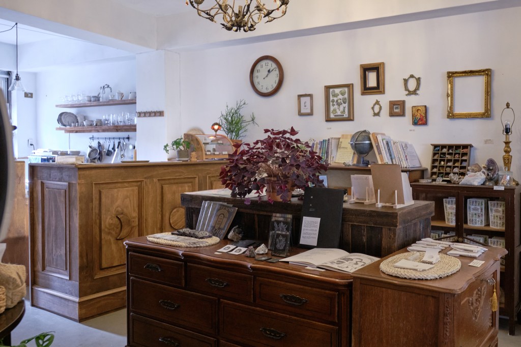 為了完整這個概念,本身是書痴的她親自挑選適合的書,現場除身心靈書籍外,也可見許多自然書寫的書,如盧梭或是台灣代表作家吳明益,甚至是教導大眾種植的書籍。因為對珍珠而言,身心靈和宗教力量無關,更關乎大自然、出於自我內在的力量,透過原本歸屬於大自然的藥草、礦物水晶和精油等媒介,喚回我們的五感本能,重新聽見大地的呼喚。
